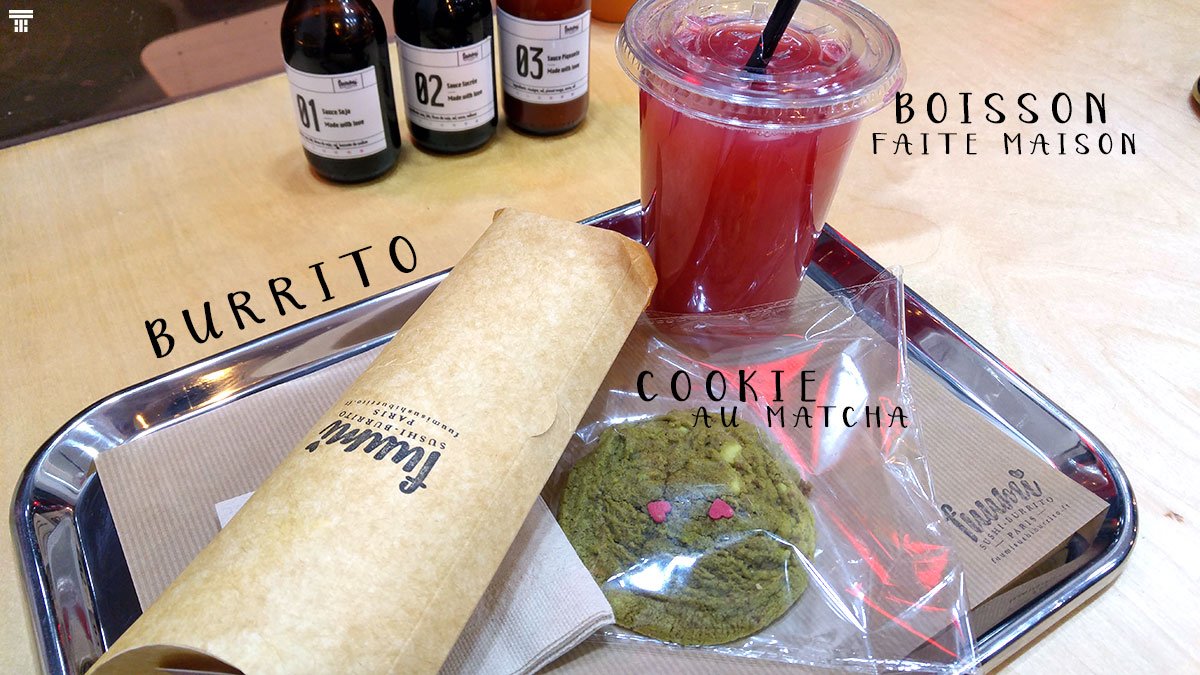 J’ai choisi un menu burrito + boisson + cookie au matcha (le tout fait maison). Le burrito est mis dans un carton que l’on vient ensuite séparer en deux à l’aide d’une bandelette située au milieu. Cela fend alors le burrito en deux gros morceaux à manger.