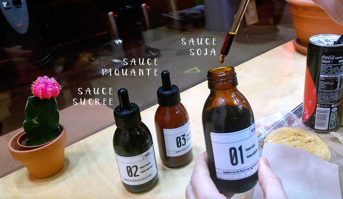 Les sauces sont mises dans des flacons avec des petites pipettes, ça fait très laboratoire de chimie mais j’adore !