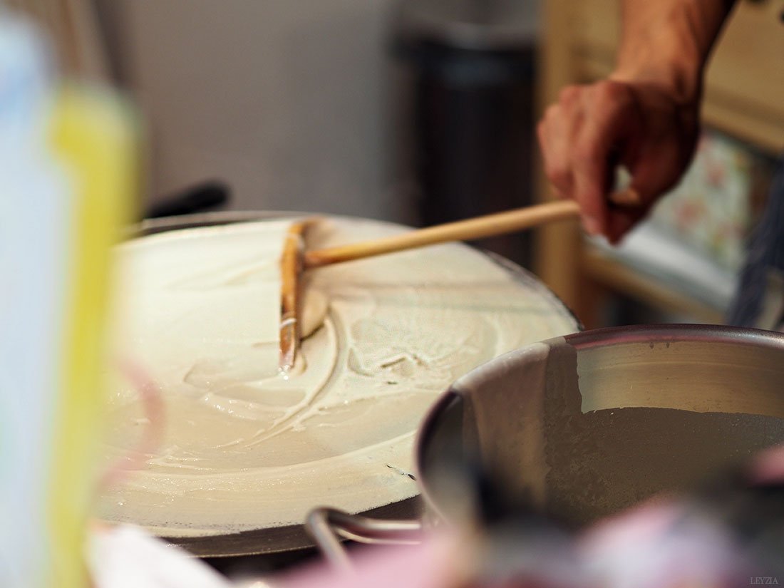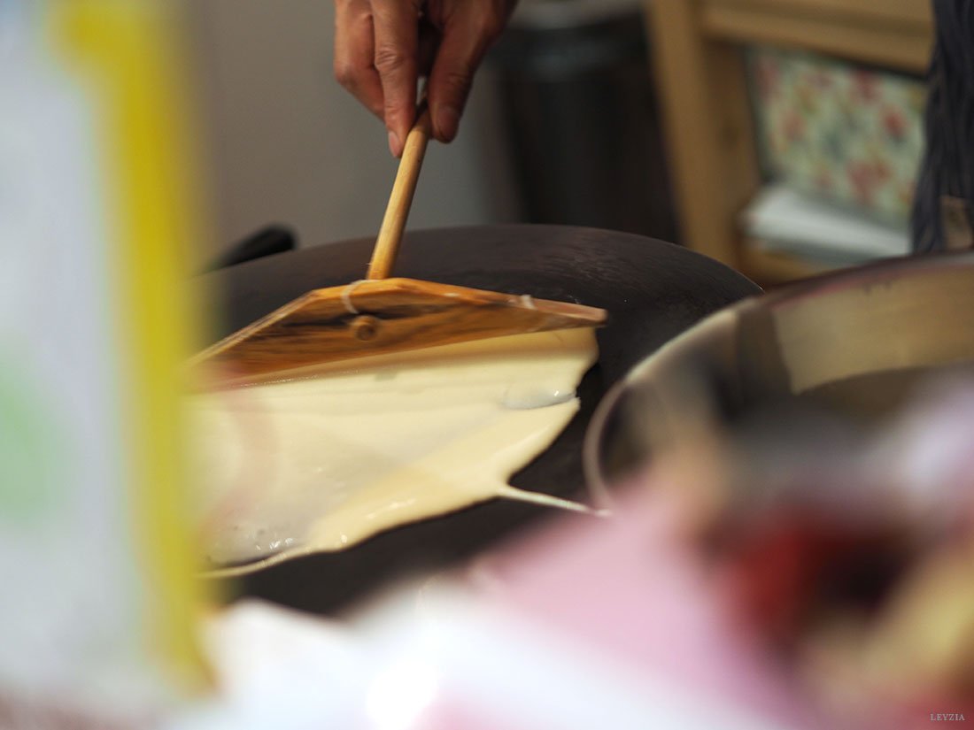 La commande passée et quelques minutes d’attente plus tard (nous pouvions voir en direct le processus de fabrication derrière le comptoir), deux énormes crêpes délicieusement belles nous furent servies.