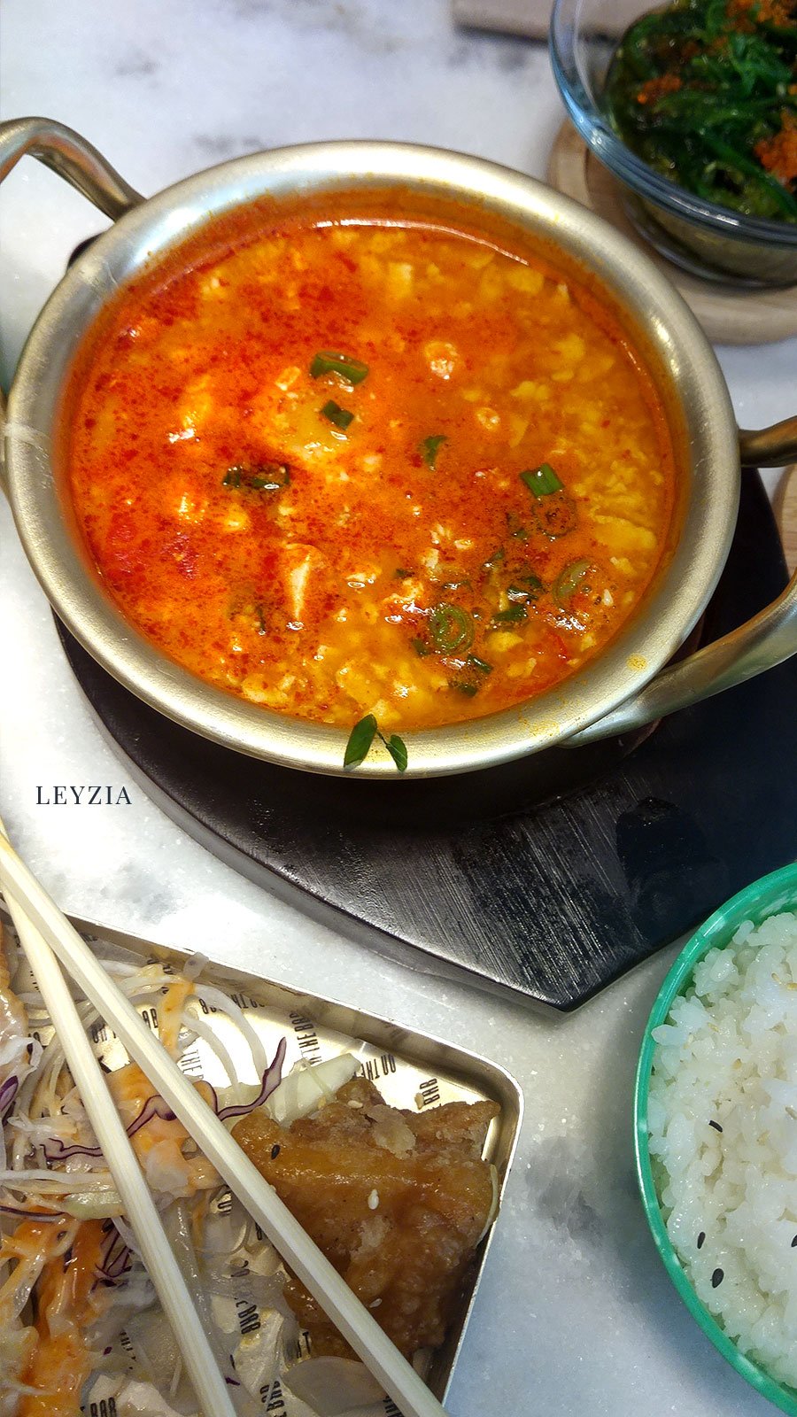 Je n’avais pas envie de goûter leurs spécialités ce jour-là (allez savoir pourquoi), j’ai alors pris une salade d’algues, du dakgangjeong, du toppoki, un ragoût au kimchi et aux fruits de mer, et un jus d’aloe vera. Et bien c’était délicieux ! Sachez que le poulet avec la sauce par dessus était super ! On a une sorte de sucré-salé donc si vous n’aimez pas ça, abstenez-vous !