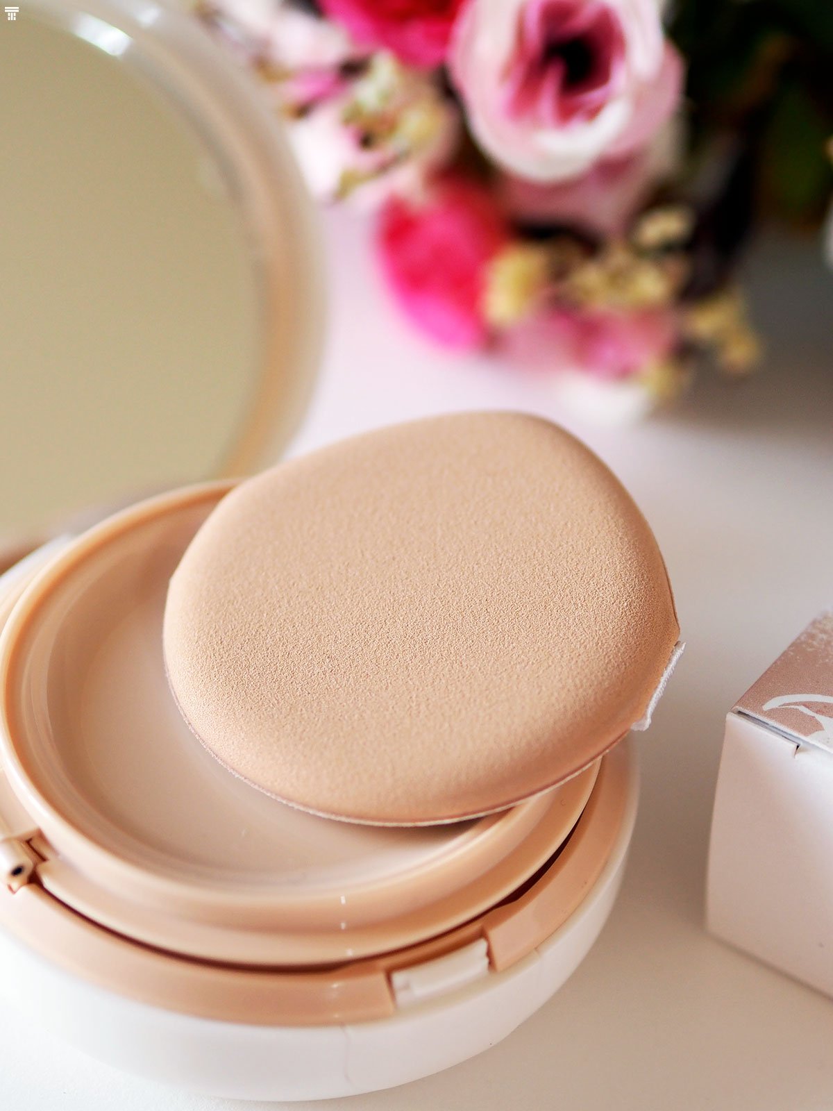 J’apprécie particulièrement la houppette en forme de goutte qui nous permet d’appliquer plus facilement la cushion sur les zones difficiles d’accès comme sur les coins du nez alors que je devais plier les houppettes classiques pour en appliquer dans ces zones.