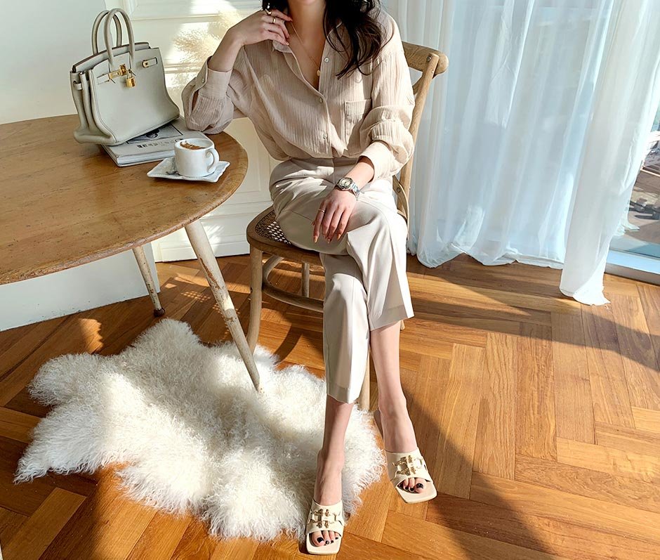 Qui dit printemps / été, dit chaussures ouvertes ! Les mules sont donc également de retour et quelques boutiques poussent beaucoup les chaussures à bout carré comme je l’ai dit dans l’article de la lady boss de Naning9. Il n’y a pas de combo coréen parfait à proprement parler, mais si vous voulez être élégante et casual à la fois je vous conseille de porter des vêtements épurés avec un côté travaillé pour donner un peu de style à la tenue (sinon ça fait trop casual sans personnalité).